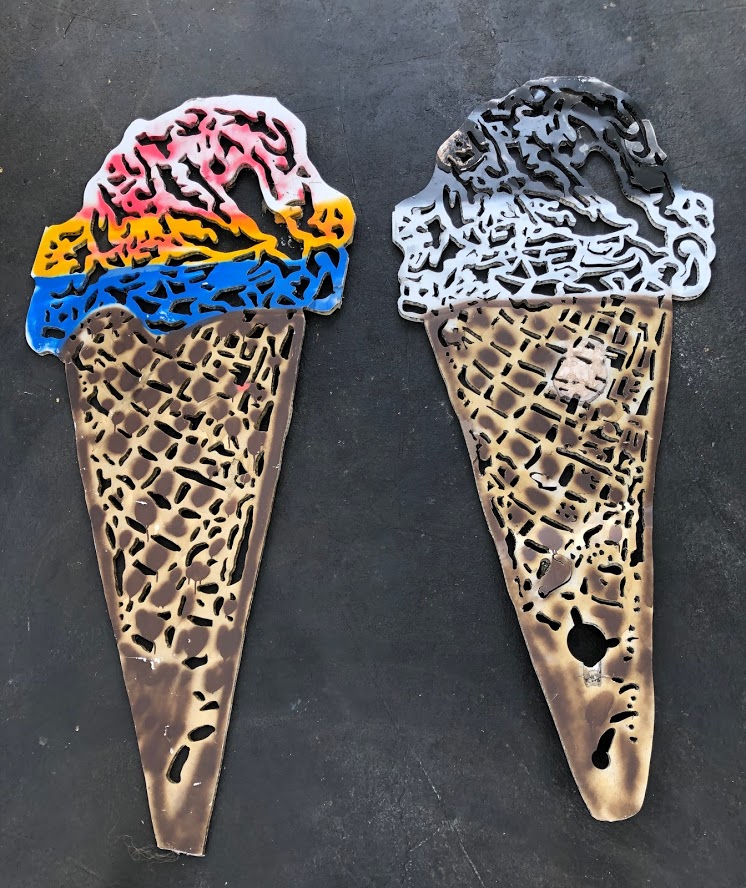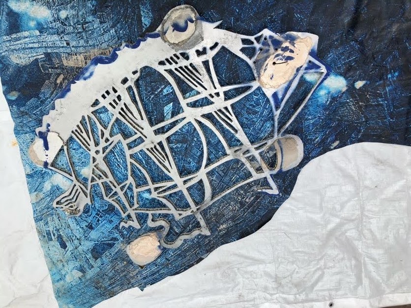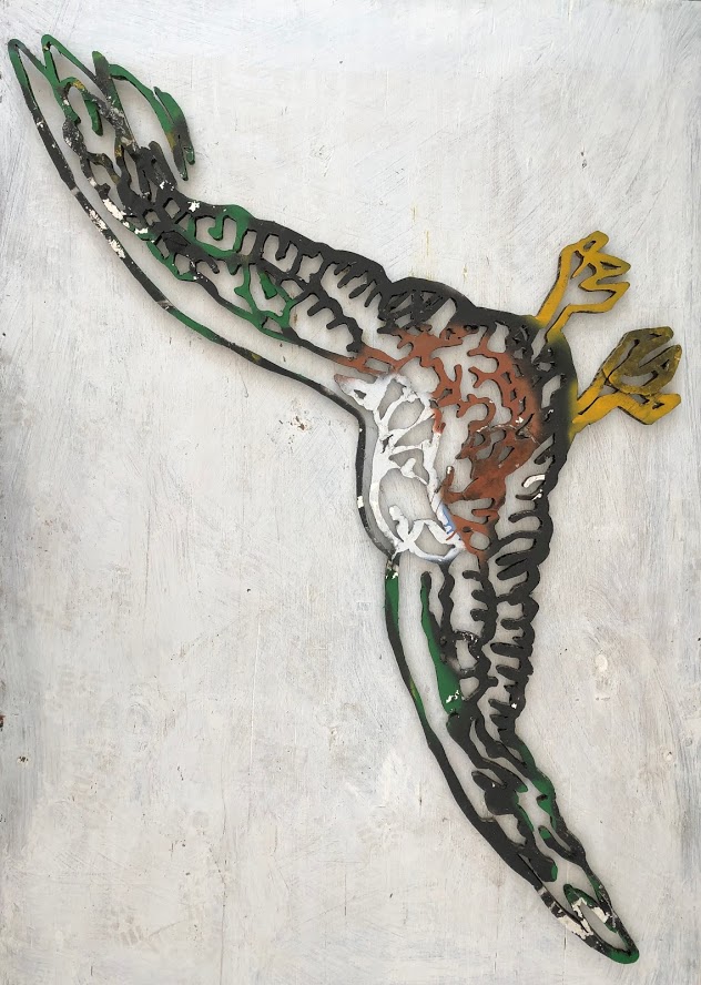 Canadian Geese 29”h x 92”wThree figures 32”h x 92”wTwin towers 77”h x 35”w (separately)Twin towers revisited 77”h x 35”w (each)Tandem braids each 59”h x 36”wTandem braids each 59”h x 36”wEagle 29”h x 73”wQuestion Mark 29”h x 16 1/2”wEmerging hand 42”h x 32”wHand in crude oil 42”h x 32”wHelicopter (negative) 32”h x 50”wHelicopter (positive) 28”h x 46”wKelp figure. 34”h x 16”wSurf shift. 17”h x 52”wLeaden balloons. 62 1/2”h x 32”wMegolem 130”h x 104”wOld Spice ship. 33”h x 49”wGulf Stream spillMegolem on course 130”h x 104”w(In) Separation of church and state. 75”h x 26”wToad 32”h X 92”w